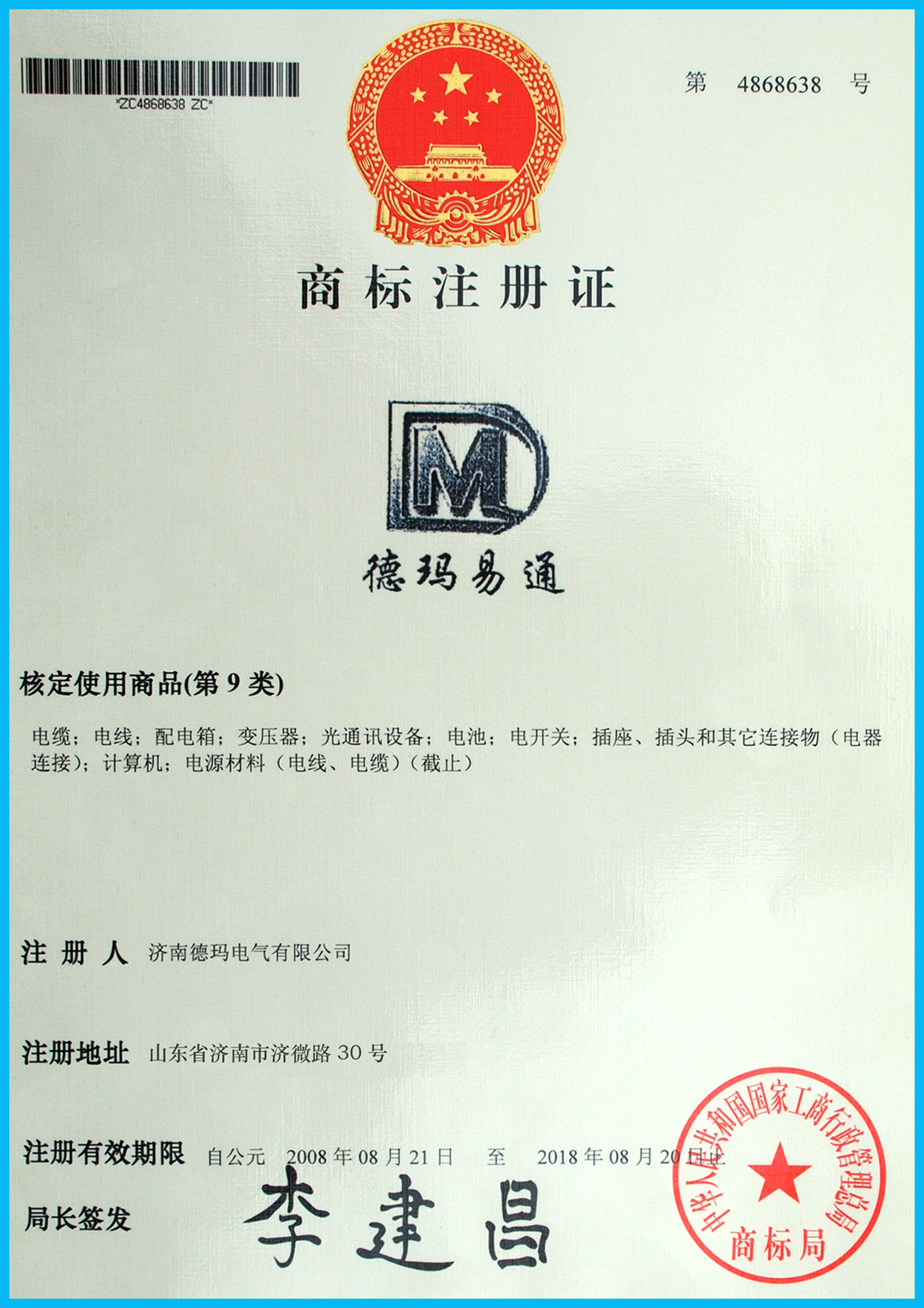 • 商標(biāo)注冊證商標(biāo)注冊證